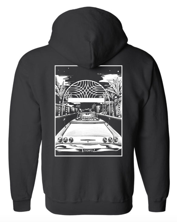 A beautiful design of a classic car, classic view, with an L.A. TACO plaque that also serves at the logo on the front of the hoodie. "TROMPO" is the license plate, which is also the nickname of our newsroom.